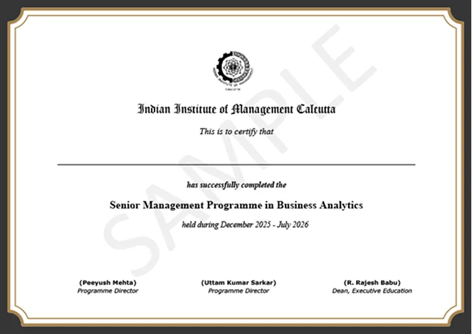 The Business Analytics Programme by IIM Calcutta Executive Education is a 8-month immersive course tailored for senior professionals seeking to lead with data-driven strategies. Designed by the first IIM to establish a dedicated analytics centre, the program reflects IIM Calcutta’s deep expertise and global recognition through triple crown accreditations (AMBA, EQUIS, AACSB).