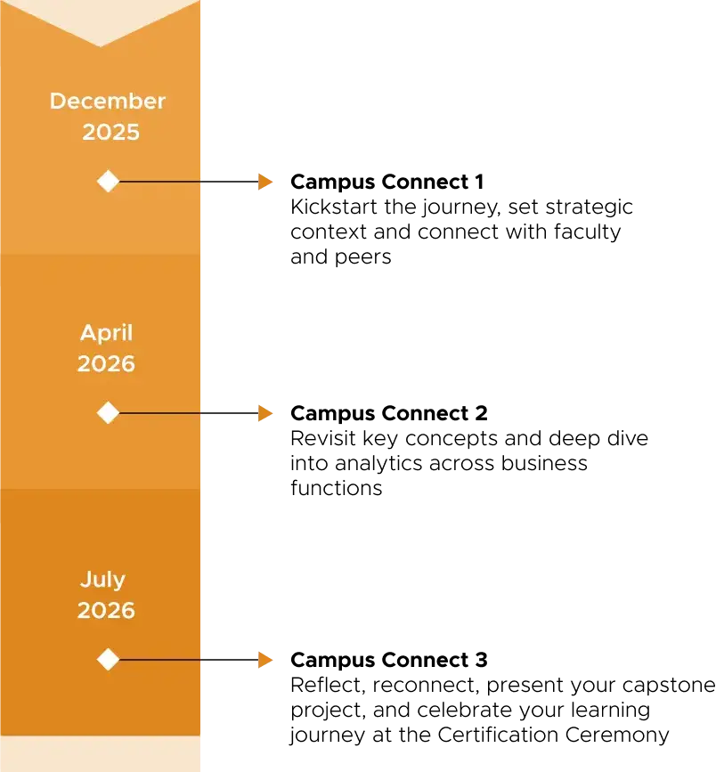 This business analytics course blends strategic insights with practical application emphasizing business outcomes over technical depth. With 75% on-campus learning, three 5-day campus immersions, and case-driven sessions, participants benefit from high-touch peer learning and faculty engagement.