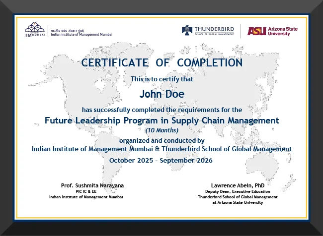 The programme is designed and delivered by the distinguished faculty of IIM Mumbai (formerly NITIE) and Thunderbird School of Global Management, ASU-USA. It is a 10-month supply chain management course packed with LIVE interactive sessions, use cases, industry-specific modules, capstone projects, and campus visits.